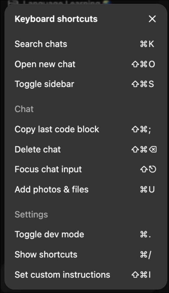To view them in ChatGPT, use Cmd + / or click on the question mark icon at the bottom-right, then Keyboard shortcuts. Here are the current options available: