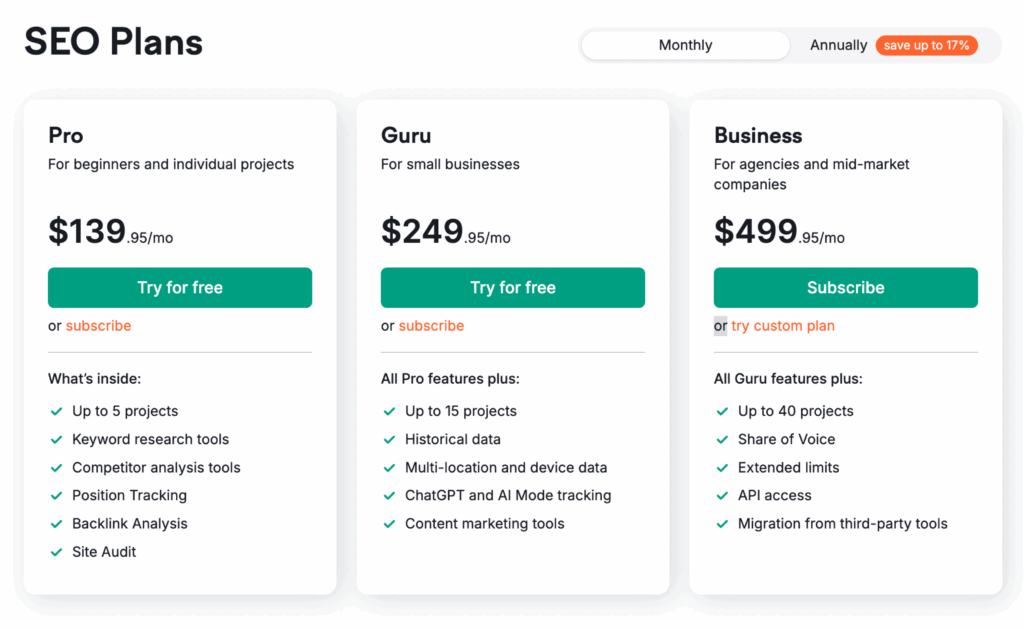Here are Semrush’s current offerings. Pricing image shows monthly rates.